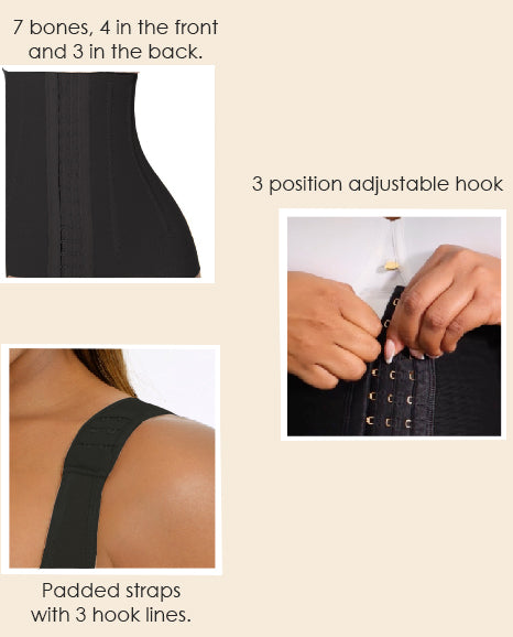 It Features: • Girdle with 7 bones, 4 in the front and 3 in the back • 3- level closure to adjust while going down in sizes • Silicone lace that adheres • Padded straps and 3 hook lines to the skin • Short style girdle with silicone lace previnting the garment to roll up. • Smart compression fabrics providing an ideal body shaping. • Double abdominal reinforcement. • Natural booty lifting system.