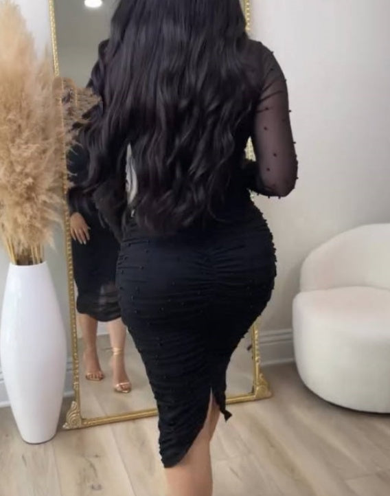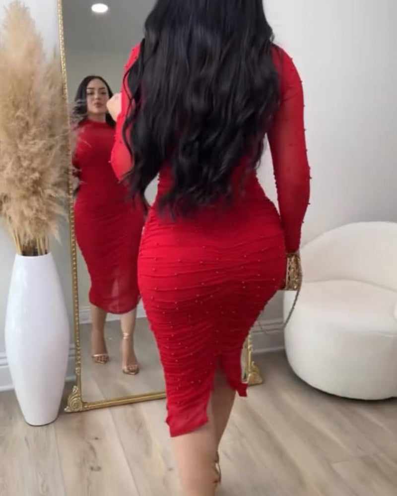 Elegant Mesh Paneled Ruched Bodycon Midi Dress with Mock Neck